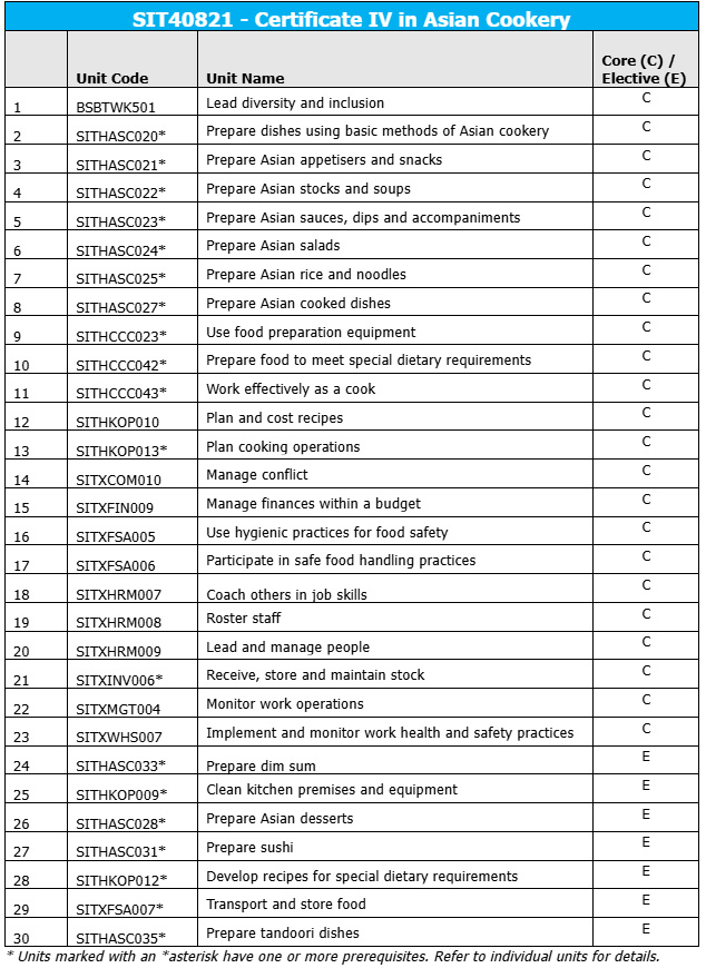 The SIT40821 – Certificate IV in Asian Cookery is a nationally recognised qualification designed for cooks and chefs who wish to take on supervisory or team-leading roles in kitchens specialising in Asian cuisine. Graduates develop advanced cooking skills and comprehensive kitchen management capabilities, enabling them to operate independently or with minimal supervision, and to respond to non-routine challenges in a commercial kitchen.